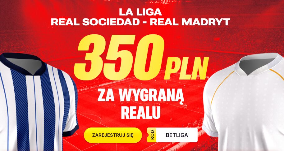 Wszystko co trzeba zrobić, to podać kod promocyjny BETLIGA w formularzu rejestracyjnych, dokonać wpłaty w kwocie min. 50 zł oraz postawić za 2 zł pojedynczy kupon obejmujący typ na wygraną Realu Madryt w sobotnim meczu. W przypadku powodzenia otrzymamy bonus o wartości 350 zł.